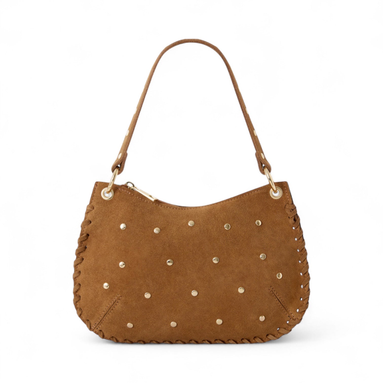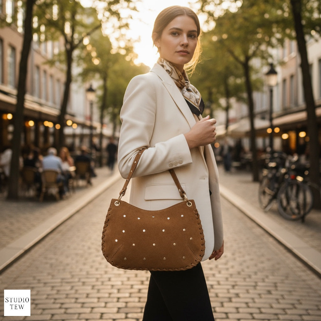 The Emmie doesn't do boring. Crafted from sumptuous suede and studded with metallic accents, this bag brings personality to every outfit. It's the kind of piece that works as hard at looking good as you do—whether you're running errands or making an entrance. Practical, bold, and unapologetically stylish.
