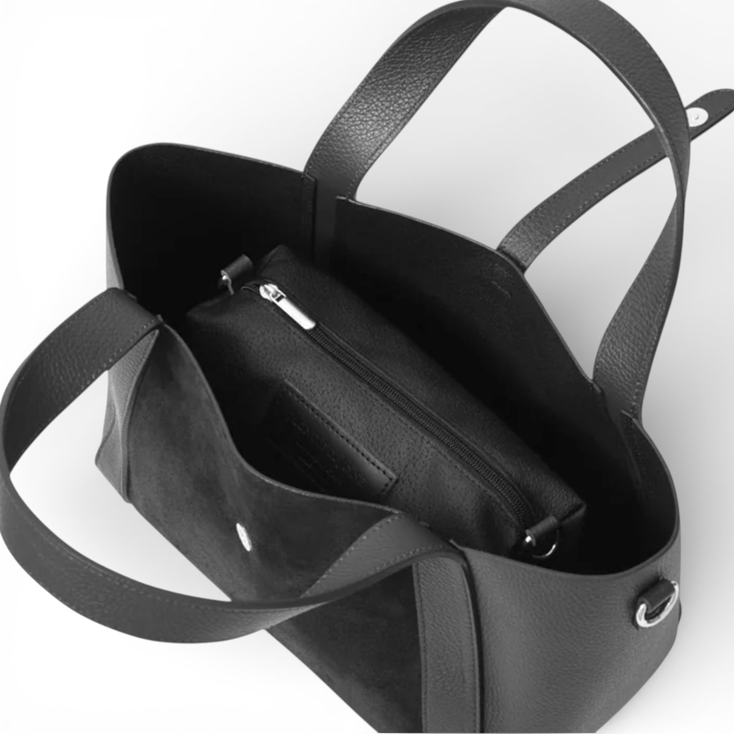 Wide, comfortable handles make it easy to carry, while subtle gold-tone hardware adds a touch of luxury without fuss. A simple snap-button closure keeps essentials secure, and the interior features a removable zippered pouch for organised storage.