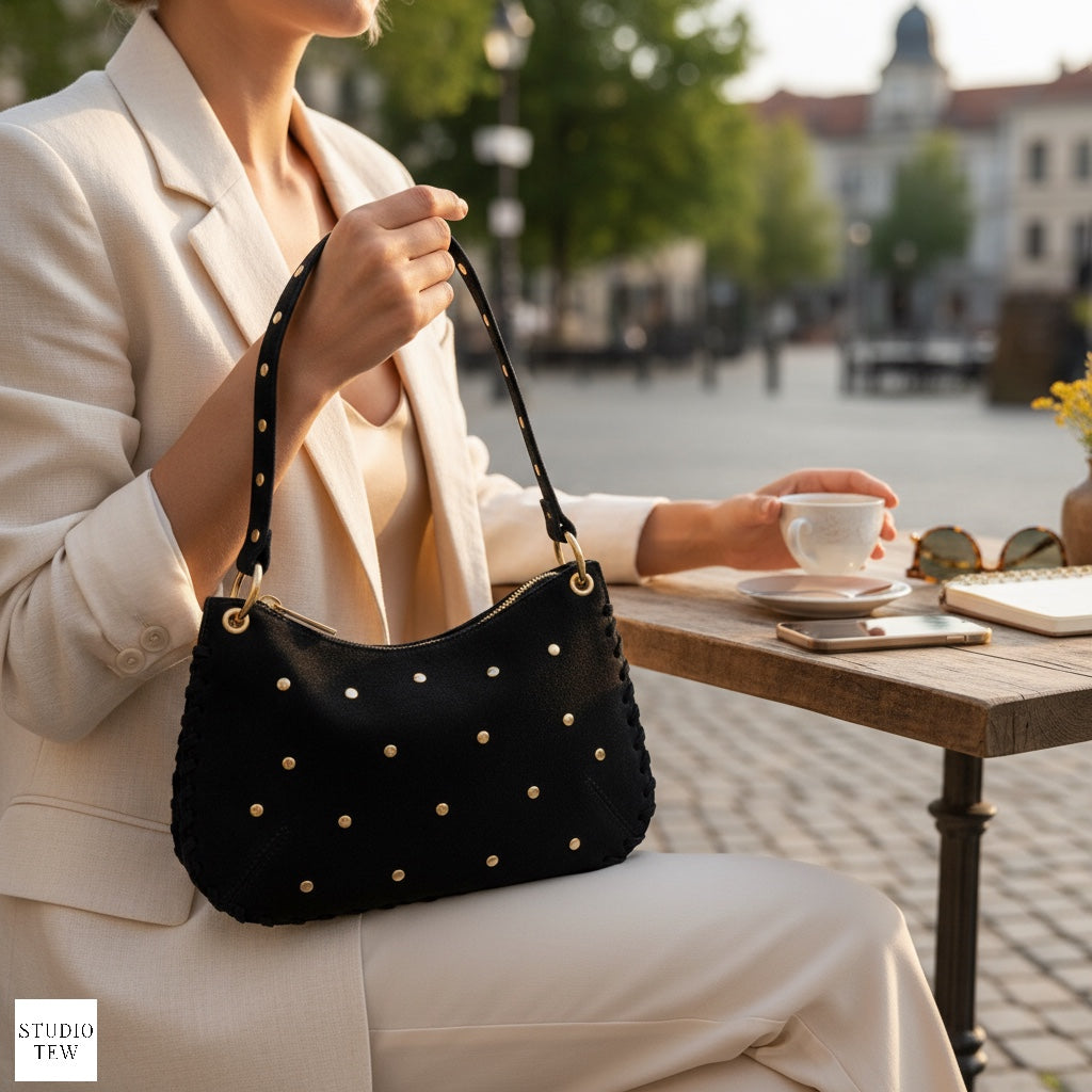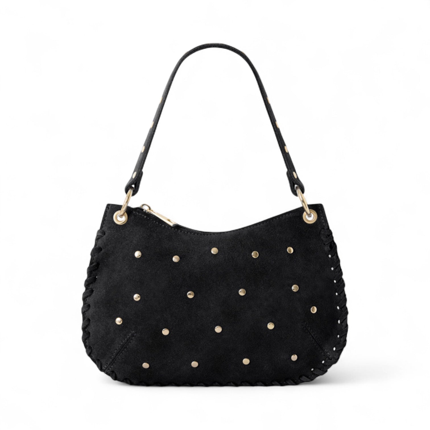 The Emmie doesn't do boring. Crafted from sumptuous suede and studded with metallic accents, this bag brings personality to every outfit. It's the kind of piece that works as hard at looking good as you do—whether you're running errands or making an entrance. Practical, bold, and unapologetically stylish.