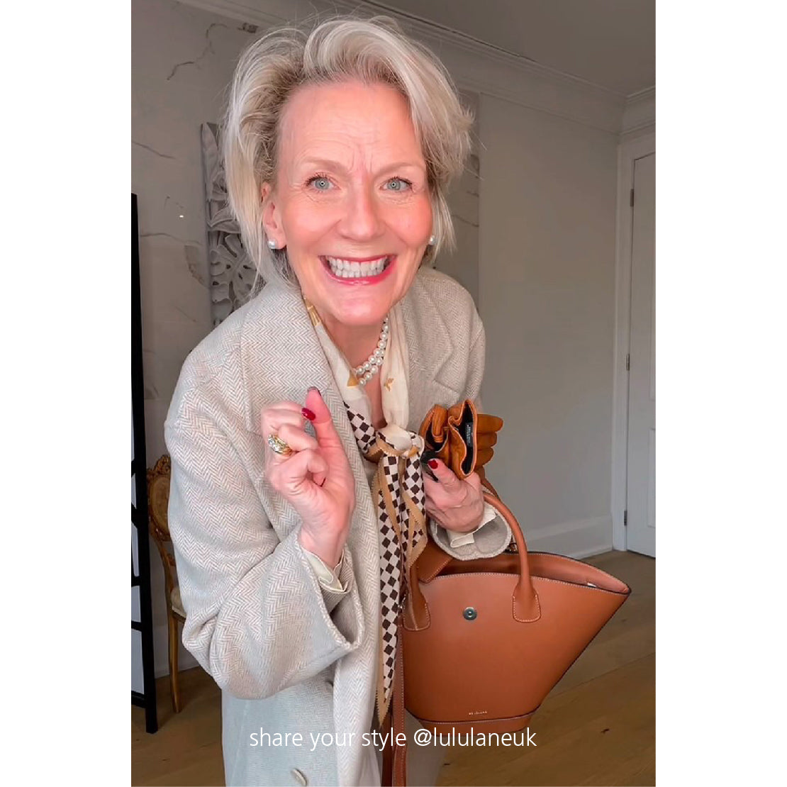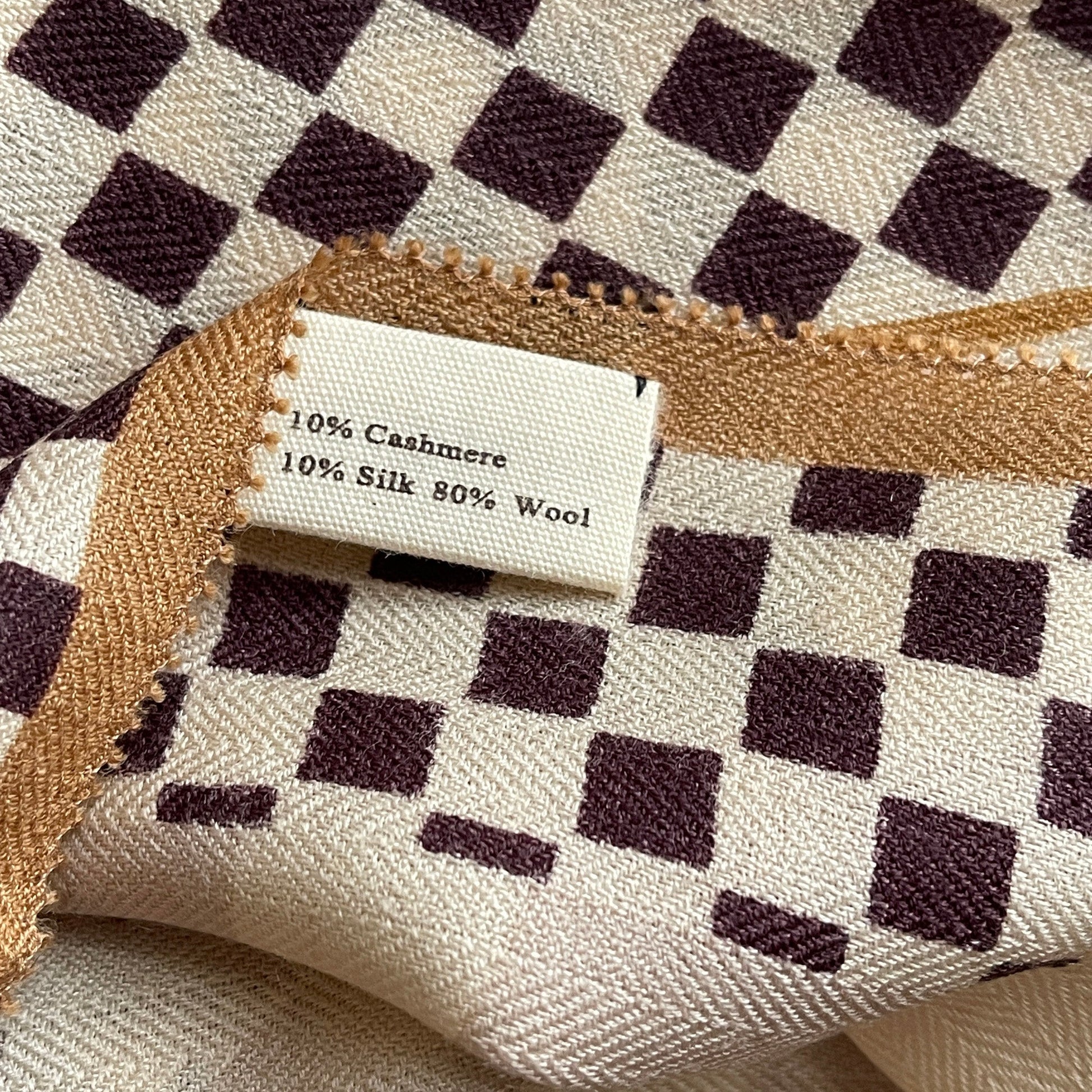 Looking for a stylish, non-bulky scarf that’s easy to match with your wardrobe? Look no further! Our luxurious blend of cashmere, wool, and silk makes this scarf the perfect choice. Thoughtfully designed in warm, earthy tones, it features a stunning pattern of stylized bird motifs framed by a checkerboard border in deep brown and cream.