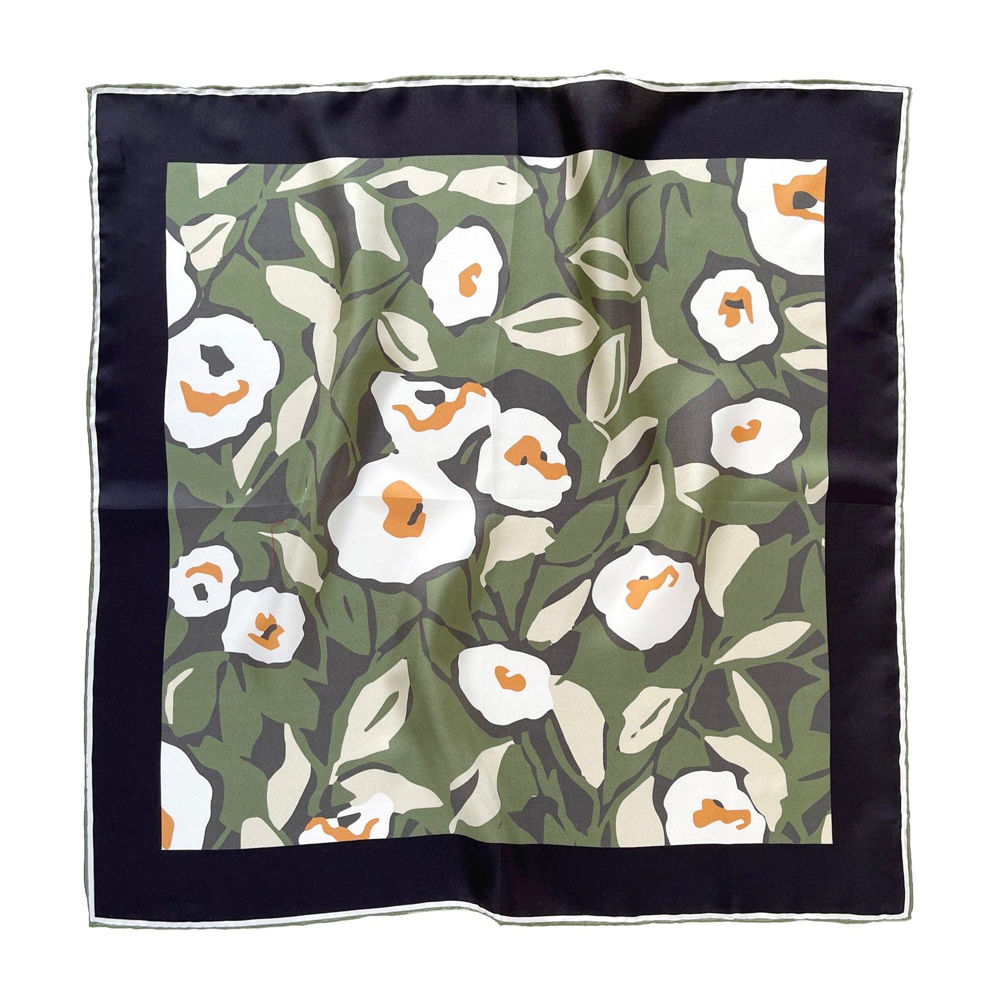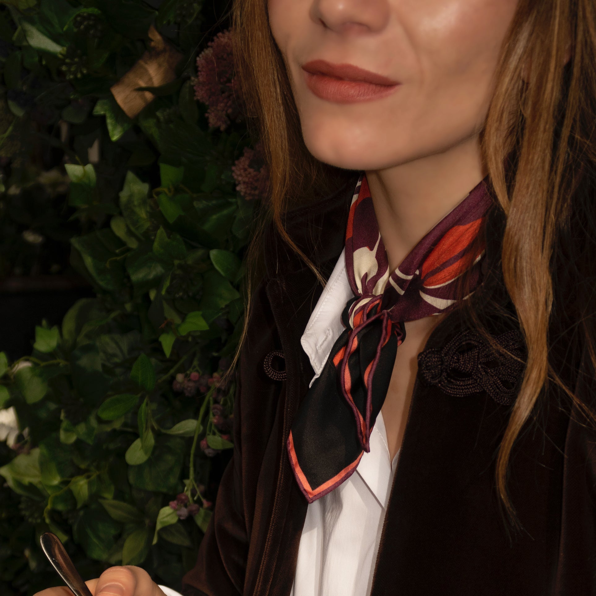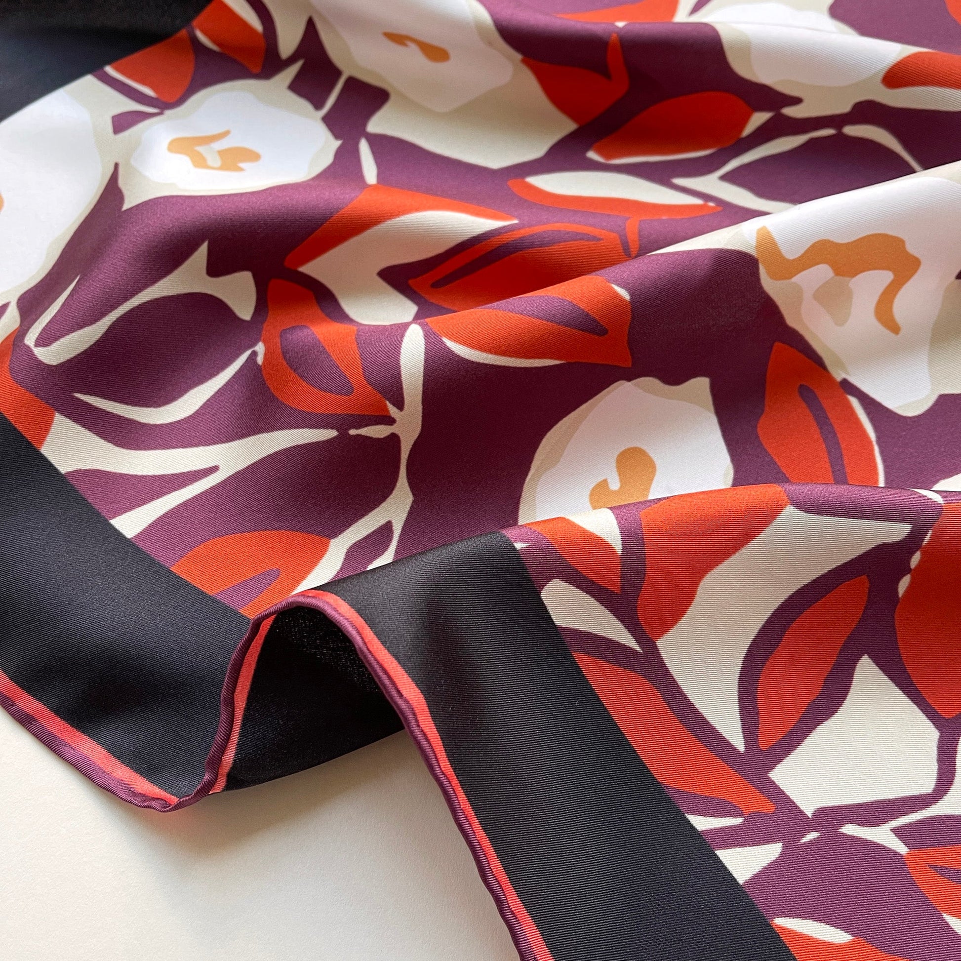 Elevate your style with this exquisite 100% silk bandana, designed to add a touch of sophistication to any outfit and suitable for both women and men. Featuring a vibrant floral print available in burgundy purple and forest green, this versatile accessory can be worn as a neckerchief, headband, or tied elegantly to a handbag.