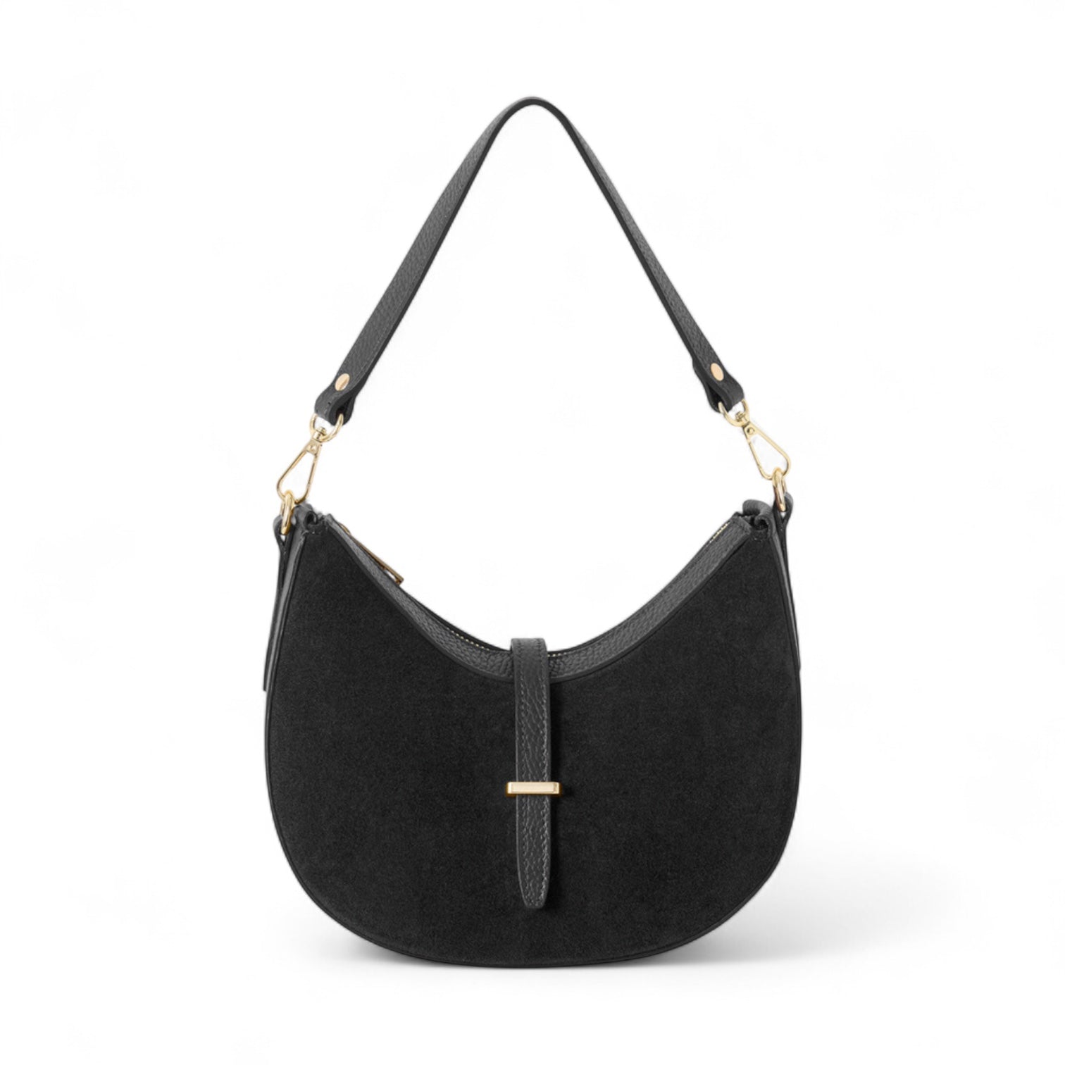 The Phoebe bag is a stylish, crescent shaped suede bag made from luxurious Italian suede. Embody sophistication and class with every use.