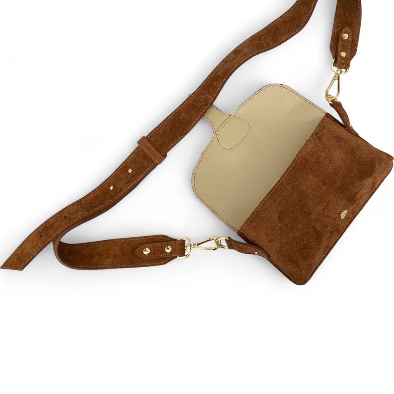 This compact crossbody bag embodies lasting elegance and charm, made from sumptuous suede to deliver a sophisticated and stylish appearance.