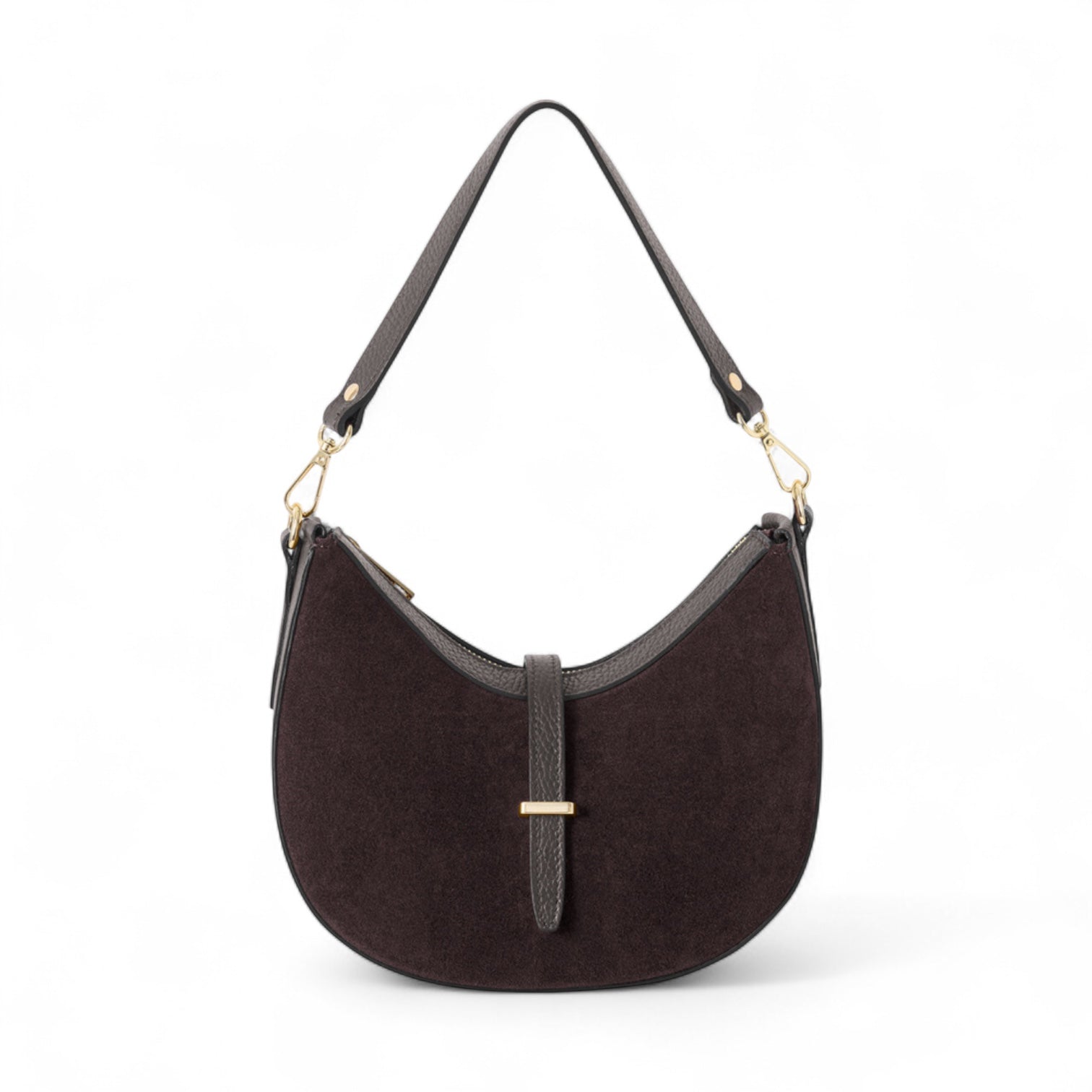 The Phoebe bag is a stylish, crescent shaped suede bag made from luxurious Italian suede. Embody sophistication and class with every use.