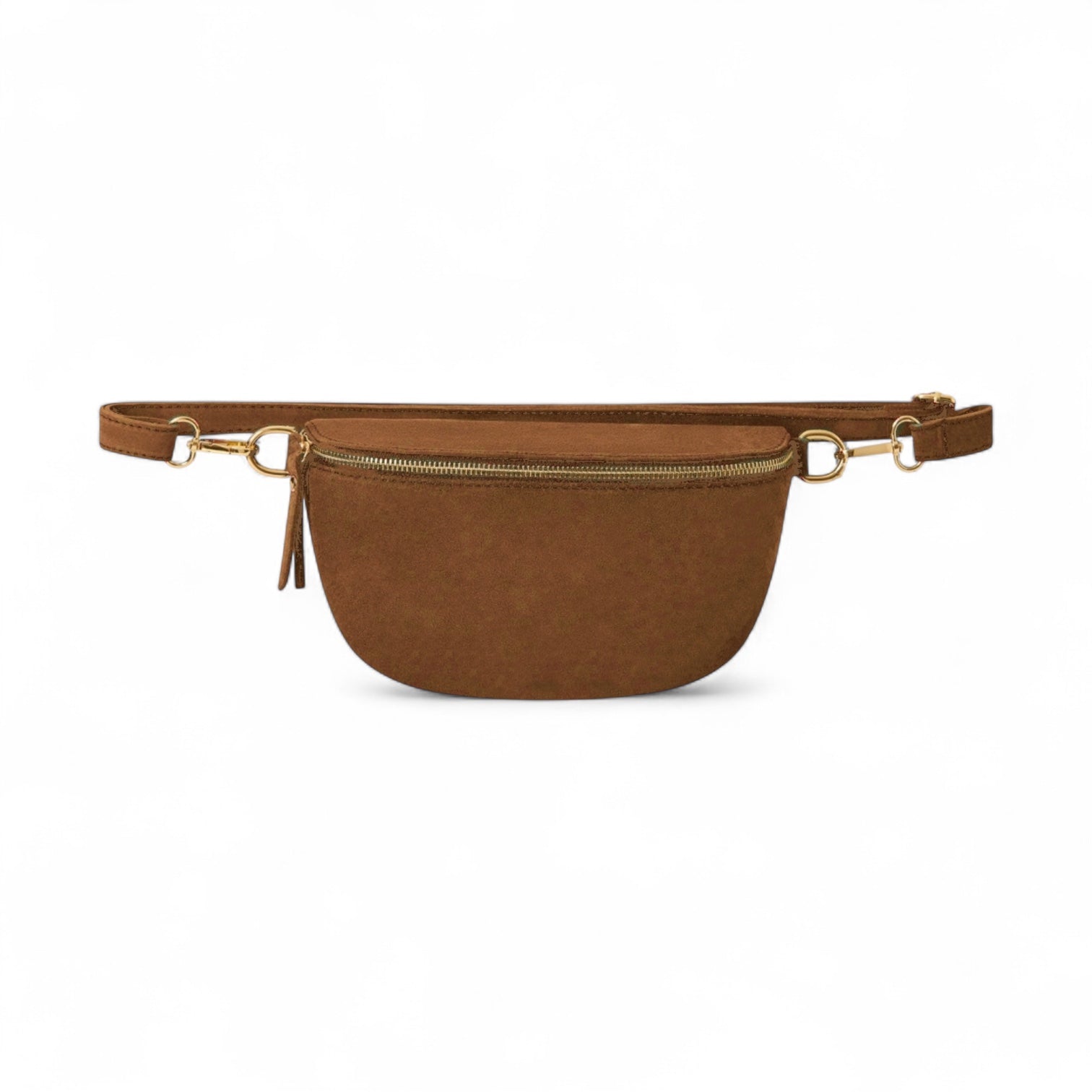 - The bag has gold hardware to complement the suede.