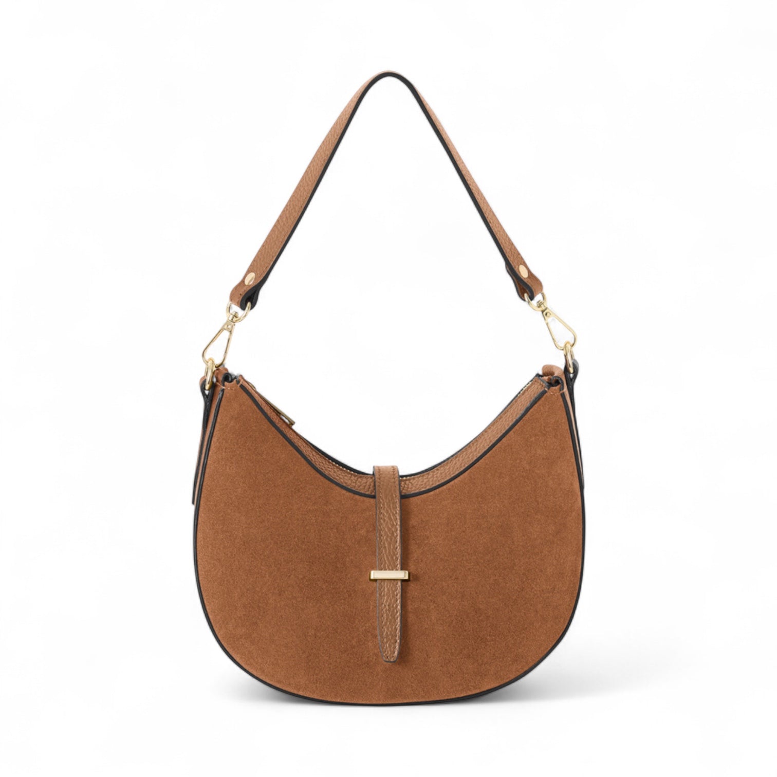 The Phoebe bag is a stylish, crescent shaped suede bag made from luxurious Italian suede. Embody sophistication and class with every use.