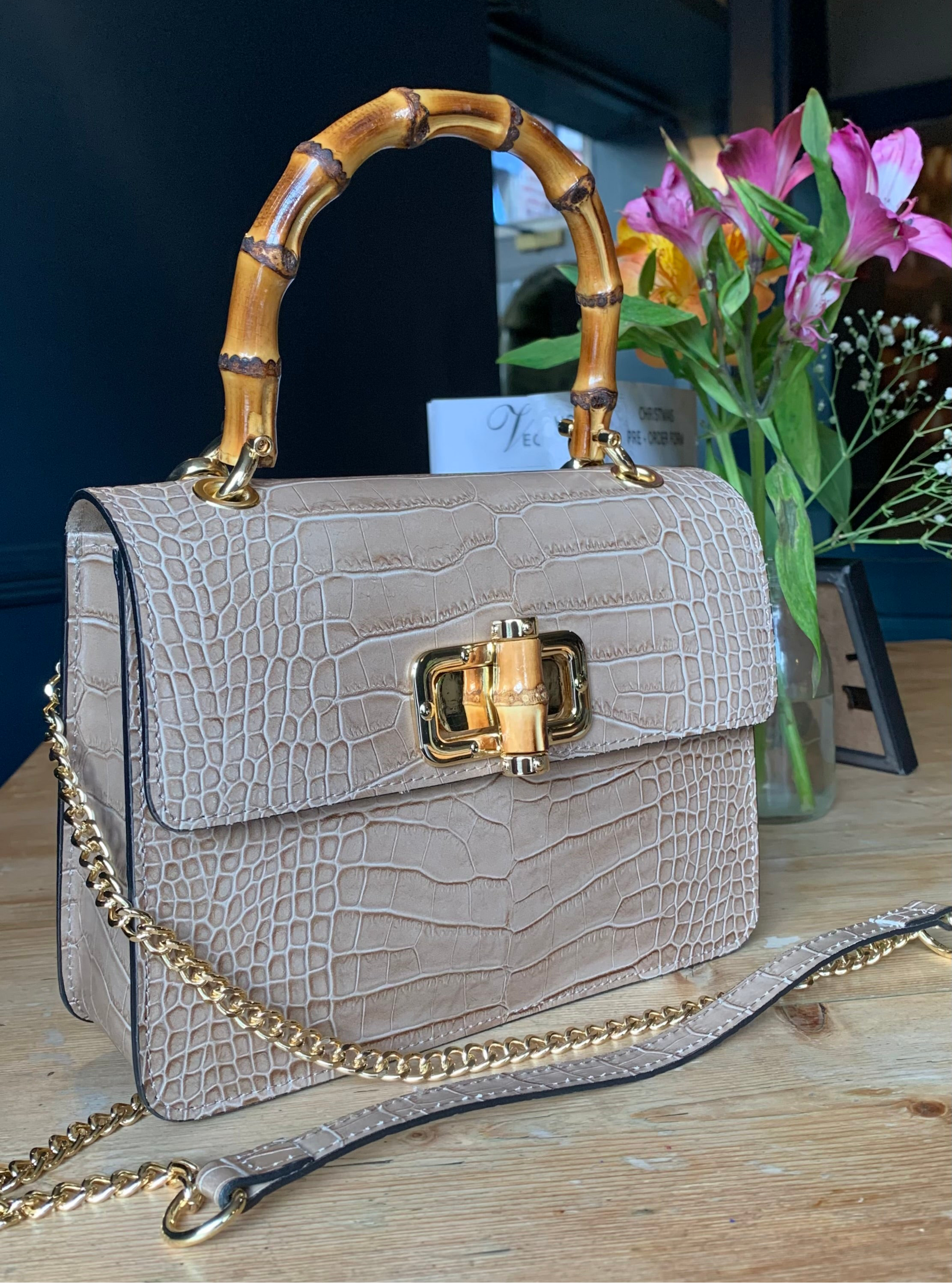 Taupe Leather Crocodile Print Bag With Twist Lock - Genevieve